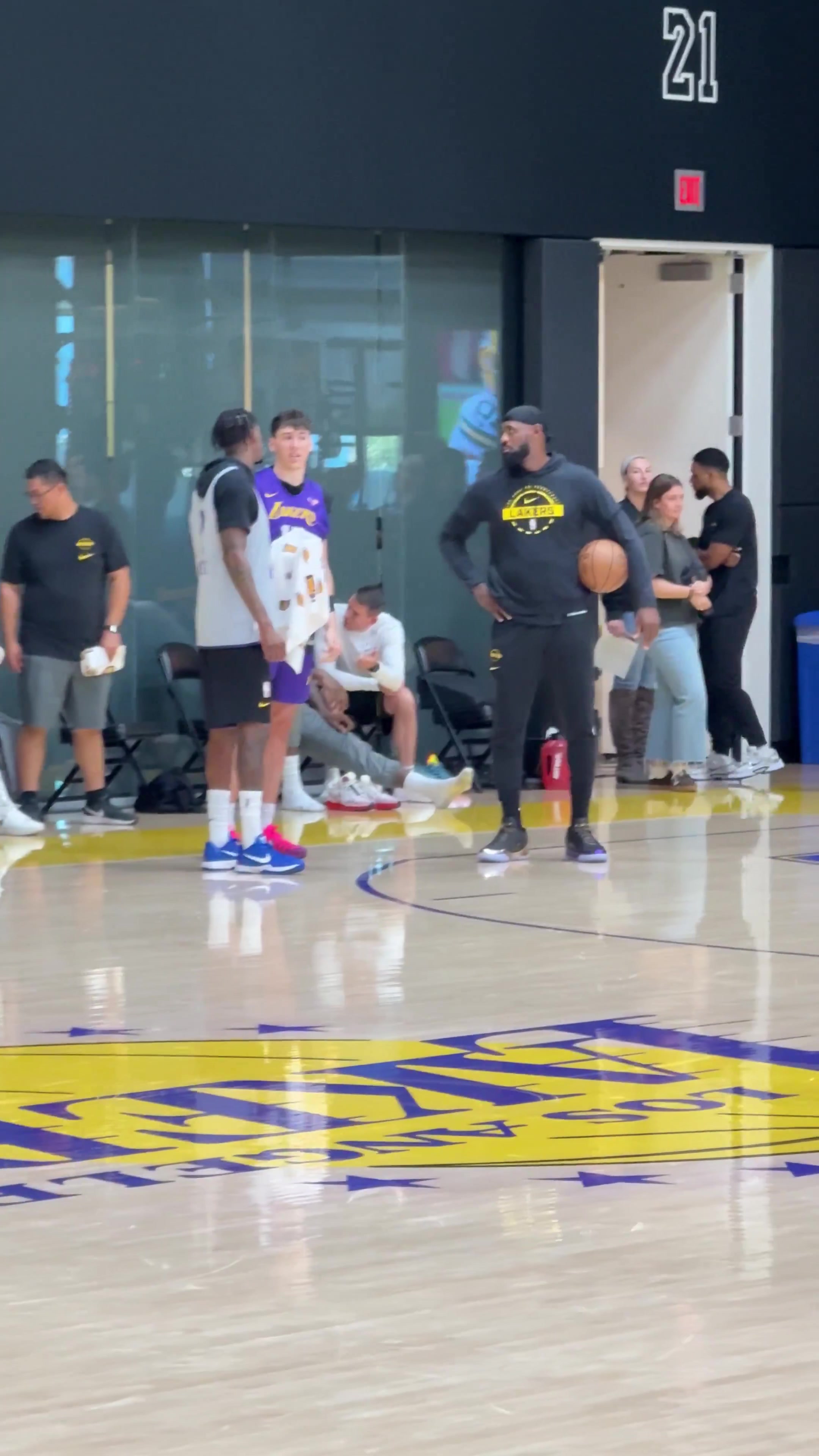 湖人训练备战揭幕战 詹姆斯抱着篮球场边观摩&与教练攀谈