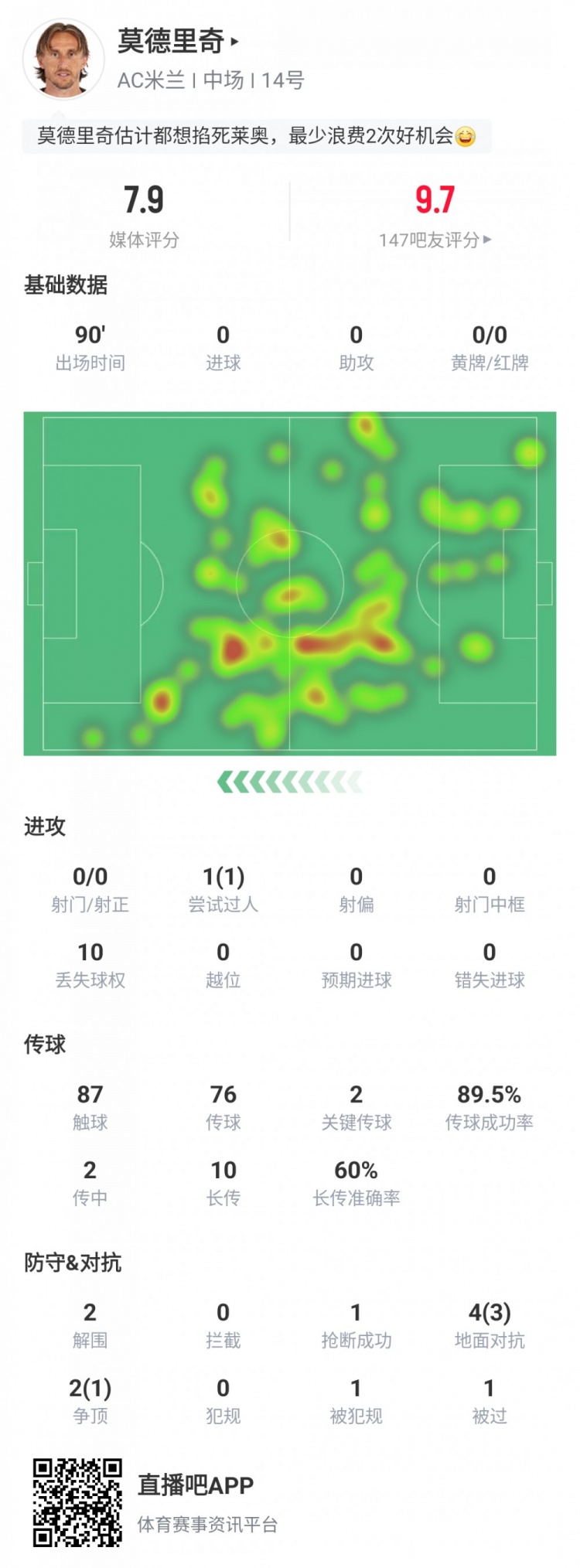莫德里奇本场数据:踢满全场,关键传球2次,传球成功率89.5%