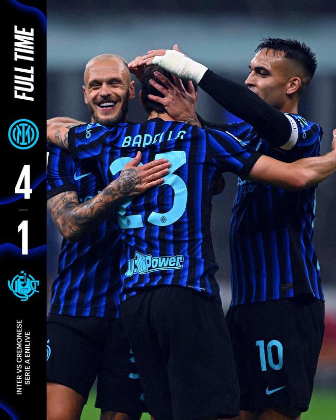 雷速体育10月5日讯 稍早前结束的意甲第6轮比赛中,国米主场4-1大胜克雷莫纳,各项赛事收获五连胜。