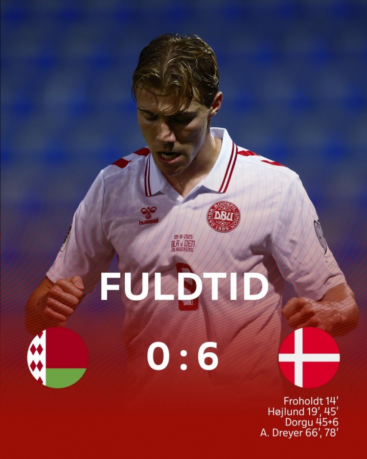 此役上半场弗罗霍尔特为丹麦首开记录,霍伊伦梅开二度,多古取得进球,丹麦4-0领先,下半场德雷尔双响,最终丹麦6-0大胜白俄罗斯。