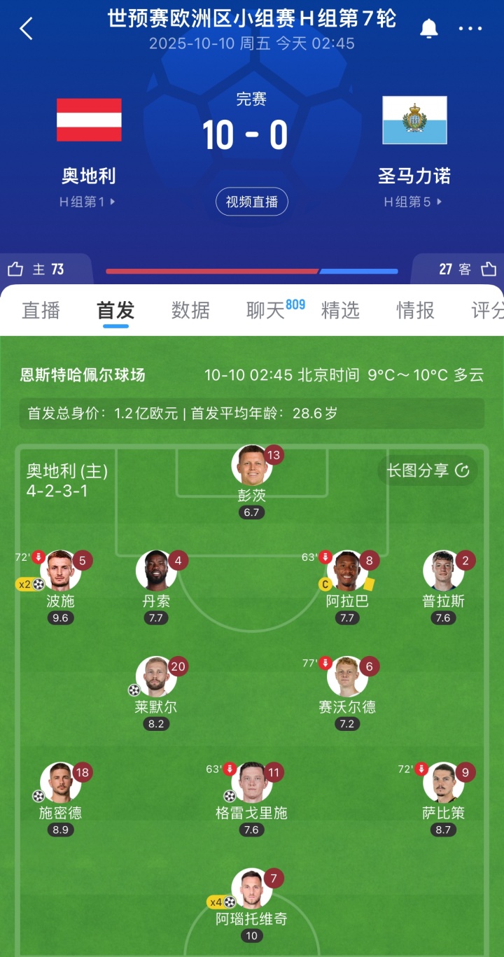 太狠了!世预赛奥地利10-0圣马力诺 首发11人除门将外均参与进球